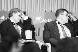 | 4月2日,“就业与增长”主题分论坛上,嘉宾世界银行行长佐立克(左)与亚洲开发银行副行长StephenGroff(右)。 本报记者 张杰 摄 |