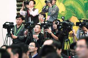 | ← 4月1日,海南省政府在博鳌召开海南国际旅游岛建设新闻发布会,图为媒体记者们专注拍摄。