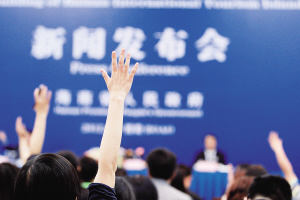 | ↑ 4月1日,海南省政府在博鳌召开海南国际旅游岛建设新闻发布会,图为会场上举手“抢问”的媒体记者。 本报记者 张杰 摄 |