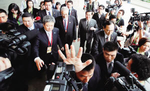 | ↑ 4月2日,在博鳌亚洲论坛2012年年会开幕大会会场外,媒体记者非常有经验地守在进入大会场的安检口处,“逮”重要嘉宾,抓新闻线索。