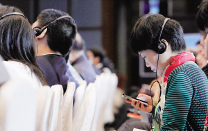 | ↑ 4月2日,论坛现场,同声传译人员在认真工作。