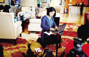 | → 4月1日,在博鳌亚洲论坛2012年年会主会场外,海南日报报业集团南海网记者在赶稿。