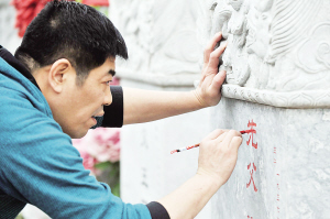 | 北京 ↑ 4月2日,在北京八宝山人民公墓,一位市民在描红墓碑上的字。