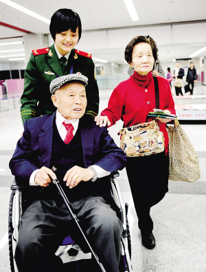 | 福建 ↑ 4月2日,从台北回祖籍福建莆田扫墓祭祖的93岁的陈天旺老人(坐轮椅者)和他的老伴在边检工作人员护送下离开机场。 新华社发 |