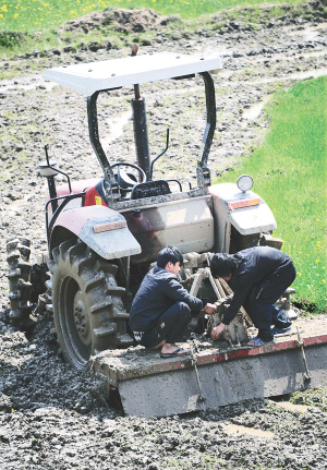 在长沙北郊的一处农田,两名男子在修整耕田机器(摄于4月1日)。 清明节前夕,湖南地区结束持续阴雨天气,气温逐步回升的三湘大地春意盎然。当地农民利用天气好转的有利时机,平整土地、栽植作物。 新华社记者 李尕 摄