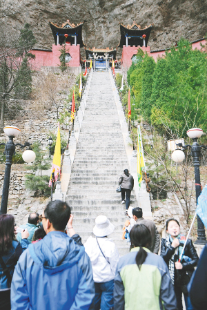 游客们正准备拾级而上,游览绵山云峰寺。清明时节正是踏青远足的好日子,作为中国清明寒食文化发源地的山西介休市绵山,也带着初春的色彩迎接来自四面八方的游客。 新华社记者 范敏达 摄