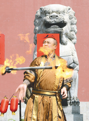 日前,在“颁新火”大典上,一位民间艺人在表演“火技”。 在河南省开封市的开封府景区广场上,举行了一场模仿宋代清明习俗的“颁新火”大典。 “颁新火”,是北宋时期清明节的一个重要习俗,每年在清明节期间举行。在仪式上,要熄灭旧火,重新钻木取火,将火种发给百姓,取除旧布新之意。 新华社记者 王颂 摄