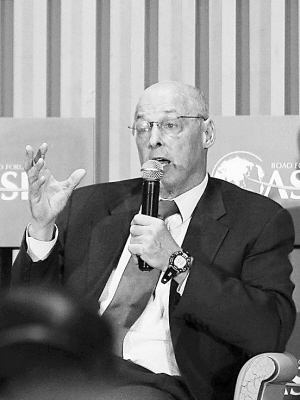 关于中国下一步的发展方式,鲍尔森首先强调扩内需。“从基本层面来讲,为了满足现在不断增长的中国人民的需求,我们就需要对中国的经济重新来平衡,更多来关注一下消费,更少地关注出口。第二点,中国这个国家更多的是一个储蓄的国家,而不是投资,所以在这方面我们需要有更好的平衡,也需要有资本市场得到进一步发展,而且是一个国际级的资本市场,更加开放的一个竞争性的资本市场有可能使人民币变成一个更加由市场决定的货币。第三点,就是可持续发展。在技术层面比如说处理水污染、环境恶化等等。从另一个角度讲,就是从政策上确保可持续发展,还包括城镇化的部分,包括提高能效、新技术发展都是非常重要的。”