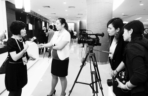 ↑ 三位女记者在采访一名女性嘉宾。