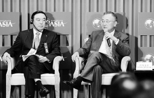 | 4月3日,“民间金融与银行业的开放”分论坛在博鳌举行。图为招商银行执行董事、行长兼首席执行官马蔚华(左)在听日本Orix董事长、CEO宫内义彦发言。