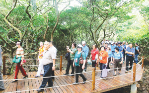 两侧的红树林郁郁葱葱,沿着蜿蜒曲折的木质小道漫步,享受着阵阵凉风,这令今天参观八门湾绿道的几十位海内外乡亲们赞不绝口。