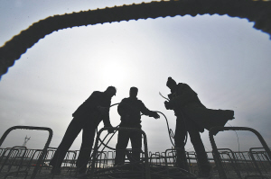 在引嫩扩建工程现场,几名工人在泄洪闸上施工(3月28日摄)。 “北大仓”黑龙江今年将投入百亿元加快推进农田水利建设,保障粮食生产。全省将续建尼尔基引嫩扩建工程、三江平原14处灌区工程、11处大型灌区续建配套与节水改造工程。 新华社发