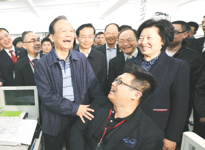 | 4月2日,温家宝在泉州七匹狼体育用品公司考察时与员工亲切交谈。 新华社发 |