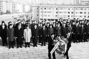 4月4日清明节,在朝鲜首都平壤,中国驻朝使馆外交官向友谊塔敬献花圈。