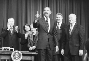 4月4日,在美国华盛顿,美国总统奥巴马(前)签字后向观众致意。美国总统奥巴马4日签署一项法案,明确禁止国会议员和联邦机构雇员利用职务之便参与证券市场内部交易,并禁止房利美和房地美在政府监管阶段向高管发放奖金。 新华社/路透