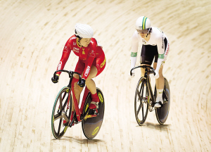 4月5日,在墨尔本举行的国际自盟场地自行车世锦赛女子竞速赛四分之一决赛中,中国选手郭爽惜败于澳大利亚选手安娜·米尔斯。 图为郭爽(左)和澳大利亚选手安娜·米尔斯在女子竞速赛四分之一决赛中角逐。 新华社发