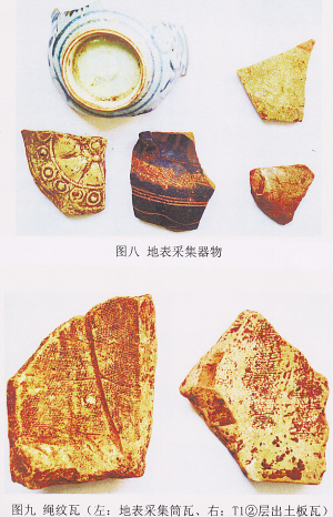 在地表踏查环节,考古人员在城址内外采集到了各类遗物,有陶、瓷、石等不同质地的器物残片,可辨器形有绳纹板瓦、筒瓦、瓦当、青砖、罐、盘、碟、碗、缸等生活用品和建筑用品,器物年代一直从汉、唐、宋时期到明清时期,其中绳纹砖、瓦与岭南地区汉代同类遗物相似;在东门外的考古勘探中,出土了少量细绳纹筒瓦残块,它们与地表采集的同类器物相似;北城墙的探沟试掘则出土较多绳纹砖、瓦和瓷片,以及极少量的绳纹板瓦残块,也与地表的同类器物相似。