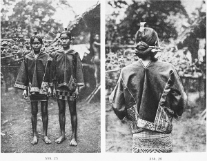 而宽衣虽说不复杂,却仍和裙子一样是适用而美观的。史图博在书中介绍,宽衣既不是开襟也不是开胸,由大小各不相同的三个部分组成,其中不整齐的中间一块,遮掩胸前与背部,中间开有从头套落去的领口。宽衣的刺绣花纹也和裙子上织成的花纹一样,样式很多,在花纹的创造与色彩的调合方面,其想象力的丰富和美丽程度都令史图博惊叹。