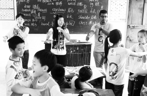 | ←3名新加坡南洋理工学院学生义工,在文昌市昌洒镇联成小学以寓教于乐的方式上英文课。 |