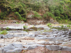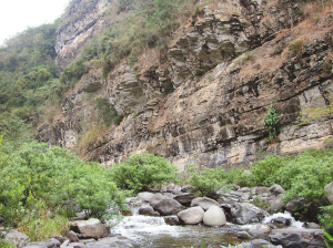 溯流而上,时或踩在河床上,沿河道两岸,时不时出现造型各异的石壁,或青、或黄、或灰,有平滑、有突兀、有峭立,似鬼斧神工,又似泼墨山水,令人叹为观止。