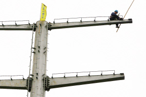 4月6日,海口大英山220千伏输变电工程施工现场,工人在25米高空作业。该工程进入最后冲刺施工,项目力争在本月底竣工投产。 本报记者 李英挺 摄