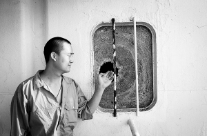 船员展示遭海盗枪击毁坏的玻璃门窗。