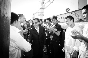 | 中国驻伊朗大使郁红阳登上“祥华门”号探望获救船员。 新华社发 |
