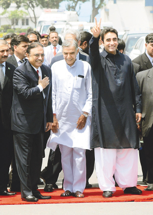 4月8日,巴基斯坦总统扎尔达里(前左)与其儿子(前右)抵达印度新德里巴勒姆国际机场。扎尔达里访问印度虽是一次“私人访问”,但两国均予以高度关注,因为这是印巴关系正常化道路上具有积极意义的一步。 新华社发