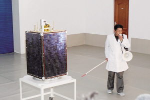 | ↓ 4月8日,工作人员在位于朝鲜平安北道铁山郡东昌里的“西海卫星发射场”综合指挥所内现场展示即将发射的“光明星3号”地球观测卫星。 新华社发 |