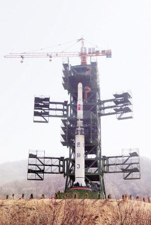 | ← 这是4月8日在朝鲜平安北道铁山郡东昌里的“西海卫星发射场”拍摄的已经基本安装完成的“银河3号”运载火箭。