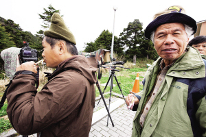 4月9日,黄春贵教授(右)和邱子槐吃着干粮等候鸟类的到来。 台湾有这么四位酷爱鸟类的摄影师:郑美娟女士、退休教授黄春贵、邱子槐先生和吴海洋先生。他们常结伴同行外出追踪并拍摄各种鸟类。迄今,他们拍摄了300多种鸟。 “我们酷爱拍摄各种鸟,宗旨是告知世人保护鸟类、保护野生动物。”黄春贵教授告诉记者。他们计划拍到500种鸟,并编纂出书,让更多人爱护鸟类,爱护野生动物,爱护大自然。 新华社发