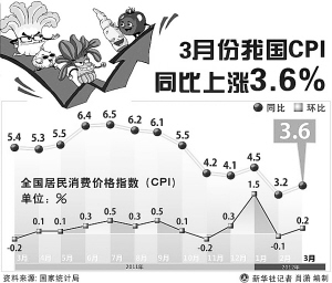 国家统计局9日公布的3月份CPI同比涨幅比上月反弹0.4个百分点,达到3.6%。