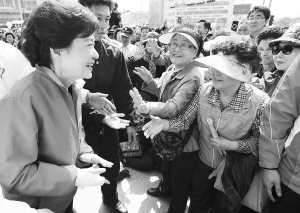 4月9日,在韩国首尔,韩国执政党新国家党领导人朴槿惠(左一)为竞选做宣传。 4月11日,韩国将进行新一届国会选举。朝野两大政党积极造势,竞争激烈。新国家党是韩国执政党,原名大国家党。新华社发