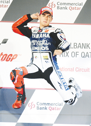 4月9日,2012年世界摩托车锦标赛揭幕战MOTOGP级在卡塔尔鲁塞尔国际赛道进行了决赛,雅马哈车队西班牙选手洛伦索以42分44秒214的成绩夺得冠军。图为洛伦索跳上颁奖台。 新华社发
