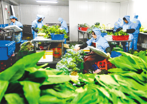 4月11日,工作人员在果蔬加工间内对蔬菜进行简单清洗、包装。 当日,“菜联网”工程在武汉启动。该项目在社区、小区内设立“报箱式”蔬菜投送柜,利用GPRS现代通讯技术和物联网技术,将顾客订购的蔬菜投放到设立在小区内的“电子菜箱”。 目前“菜联网”工程,已经进入武汉市240多个小区,每天为3000多个家庭提供生鲜配送。 新华社发
