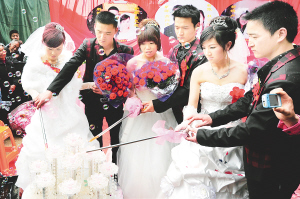 4月11日,高振江、高闯江、高渡江(自左至右)和各自的新娘在参加集体婚礼。