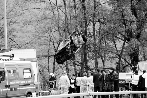4月13日,在法国中东部的尚贝里,发生车祸的事故车被吊起。
