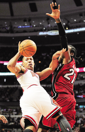 | ← 公牛队球员罗斯(左)与热火队球员图里亚夫在比赛中拼抢。 新华社发 |