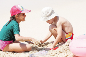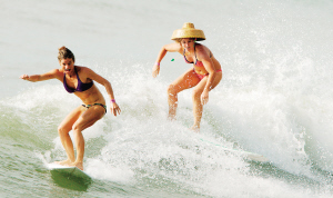 | ←万宁日月湾海滩,国外冲浪者戴上了具有海南特色的斗笠起舞浪尖。(资料照片) 本报记者 王凯 摄 |