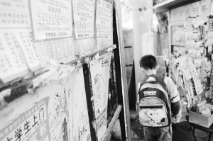 | 四月十六日,南京市一名小学生从课外“补习班”广告旁走过。 新华社发 |