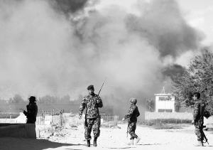 | 4月15日,在阿富汗东部楠格哈尔省首府贾拉拉巴德市的北约省级重建小组大楼附近,士兵在袭击地点附近警戒。