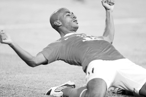 | 17日,在2012年亚冠联赛H组第四轮比赛中,广州恒大队主场以3:1战胜日本柏太阳神队。图为广州队穆里奇庆祝进球。 新华社发 |