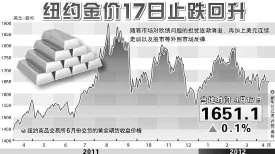 纽约金价17日止跌回升