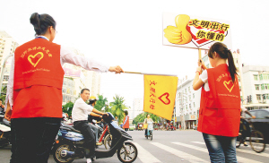 | 大学生志愿者走上海口街头倡导文明交通,成为城市文明一道靓丽风景。 本报记者 张杰 摄
