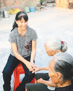 | 唐爱梅正在与孤寡老人谈心。
