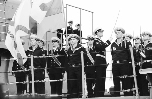 | ↑4月21日拍摄的俄罗斯太平洋舰队旗舰—“瓦良格”号导弹巡洋舰上的仪仗队员。 新华社发 |