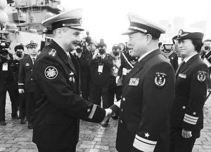 | ↑4月21日,中国海军北海舰队副司令员杜希平少将(前右)在码头迎接俄方官兵。 新华社发 |