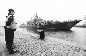 | 4月21日,俄罗斯太平洋舰队旗舰—“瓦良格”号导弹巡洋舰驶入青岛某军港。 新华社发 |
