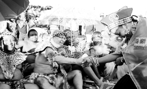 4月20日,在南非夸祖鲁-纳塔尔省的恩康德拉村,南非总统祖马与夫人在婚礼上握手。 南非总统祖马当天在其家乡夸祖鲁-纳塔尔省的恩康德拉村迎娶了他的现任第四位妻子班吉·恩格玛。这是今年70岁的祖马第6次结婚。南非法律允许一夫多妻制。祖鲁人是南非最大的黑人部族,该部族有一夫多妻的传统。自南非种族隔离制度于1994年结束以来,祖马是该国第一个同时拥有数位妻子的总统。 新华社发(梁铨摄)