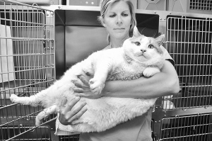 4月19日,兽医珍妮弗抱着2岁大的肥猫“喵喵”。通常说来,成年的猫体重大都在7磅到12磅之间,而“喵喵”的体重超过了39磅(约17.69千克)。新华社/美联